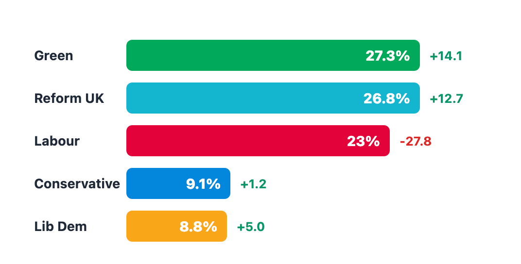 The question is what happens to the ~41% currently voting Labour, the Conservatives and the Lib Dems. In a Green vs Reform fight, do they pick a side?