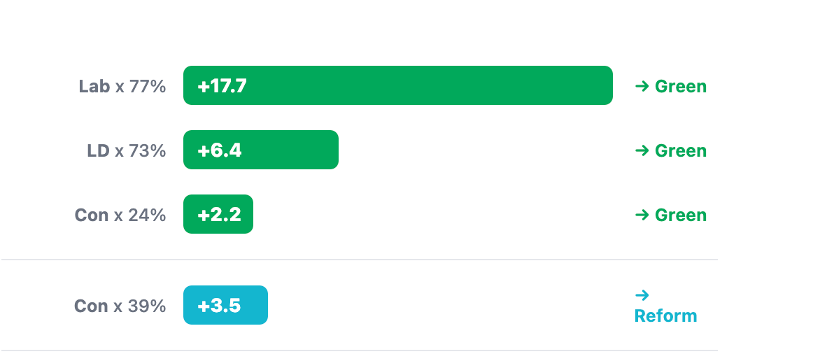 Lib Dem voters (8.8%): 73% would switch to Green if they were the only realistic challenger to Reform. That’s potentially +6 points to the Greens.