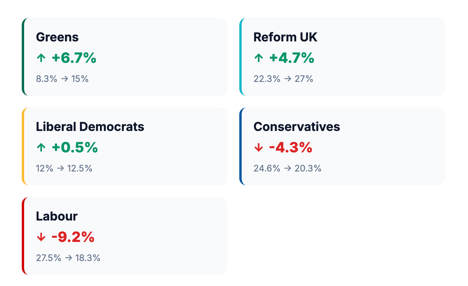YTD, Reform rose 6.2% and Labour dropped 10.8%. Plaid Cymru and the Greens also made gains, at +2.7% and +4.5% respectively.