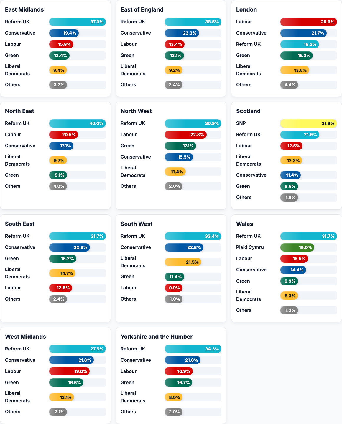 As well as being first in Wales and second in Scotland Westminster polling, Reform lead most of the English regions, with the Conservatives often in second. London is the exception where Labour leads:
